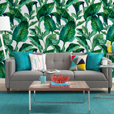 Обои с тропическими листьями добавят в интерьер простора и свежести. Зеленый цвет благоприятно воздействует на психику в следствии чего в помещении с этими обоями вам будет легче расслабиться.